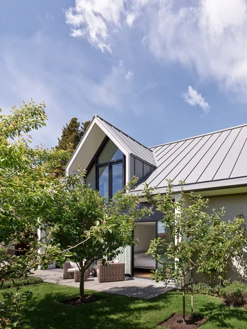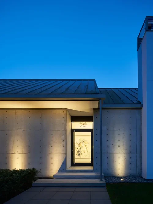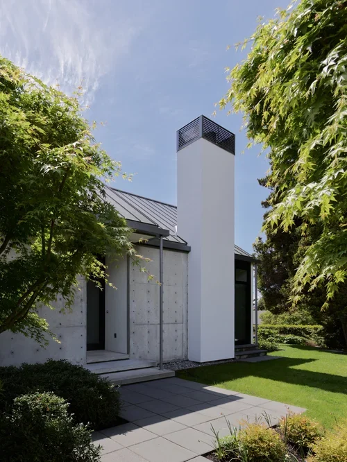 The steeply pitched roof was leveraged to increase interior ceiling heights while accommodating oversized guttering sized for West Coast rainfall intensities. Roof runoff is captured and directed to an underground cistern integrated below grade. The collected water is filtered to potable standards and serves as the home’s primary water source for both domestic use and irrigation. The system reduces municipal water demand and required early coordination between structural, civil, and mechanical scopes to ensure long-term reliability and serviceability.