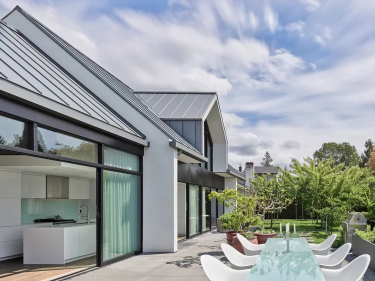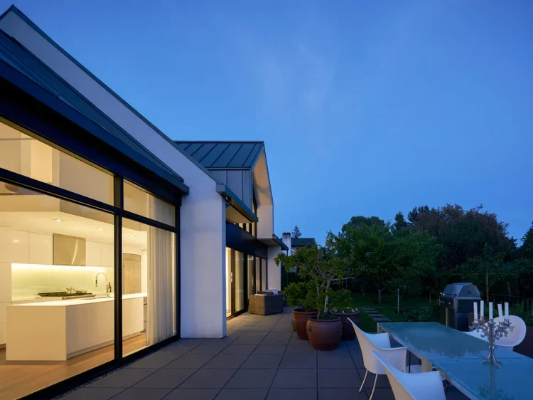 Built for Robert and Marieke Burgers—their twelfth and final personal residence in West Vancouver—the project addresses a high-traffic Fulton Avenue frontage by pushing primary living areas to the rear of the site and using a landscaped orchard as an effective acoustic and visual buffer. The rear yard includes productive plantings from blueberries to figs and was designed as a functional, maintainable landscape rather than purely decorative green space.